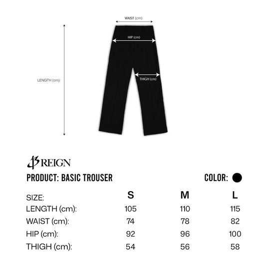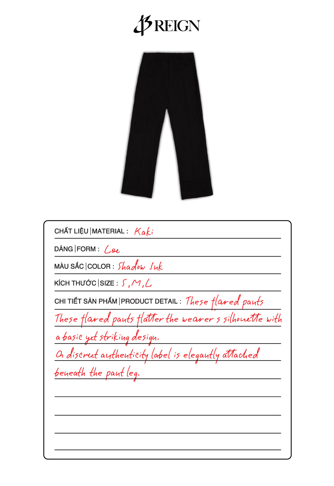 13Reign Basic Trouser - Black Ink - These flared trousers are designed to enhance the wearer’s silhouette with a basic yet striking look. A discreet anti-counterfeit tag is attached under the hem. Perfect for men and women, ideal for everyday wear or casual outings. Made in Vietnam, ensuring high quality and durability.