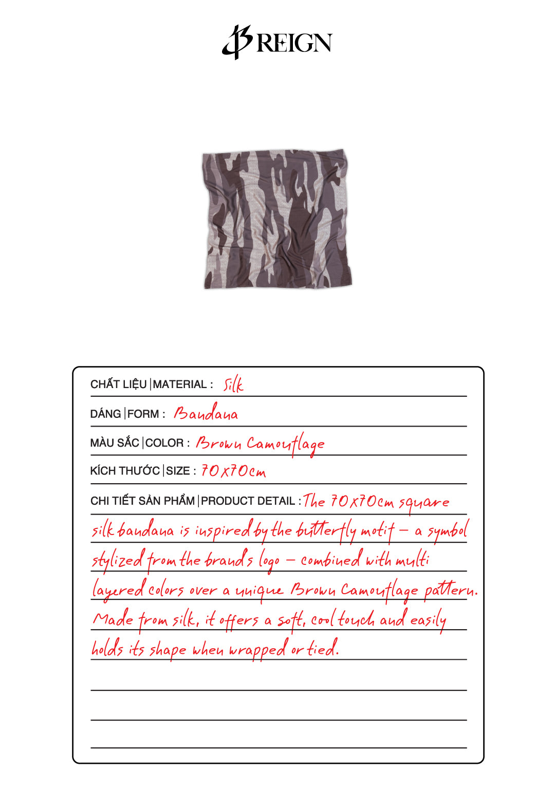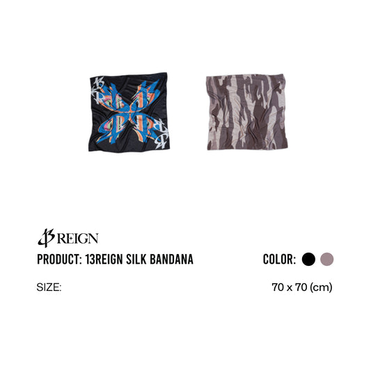 13Reign Silk Bandana – Camo Edition (Brown) – Inspired by classic military camouflage, this square silk bandana features a unique color arrangement with a subtly printed logo beneath the camo layer. A standout fashion accessory for both men and women.