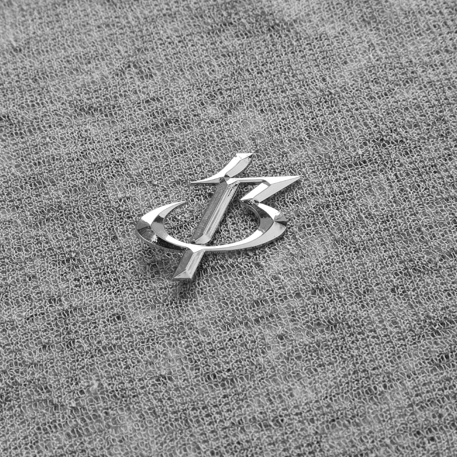 The design highlights an asymmetrical layered construction running diagonally from the neckline to the waist, combined with gathered details on both sides to create a naturally draped, subtly sensual silhouette. A logo pin fastened at the cross-layered panel adds visual depth and a distinctive, bold character.