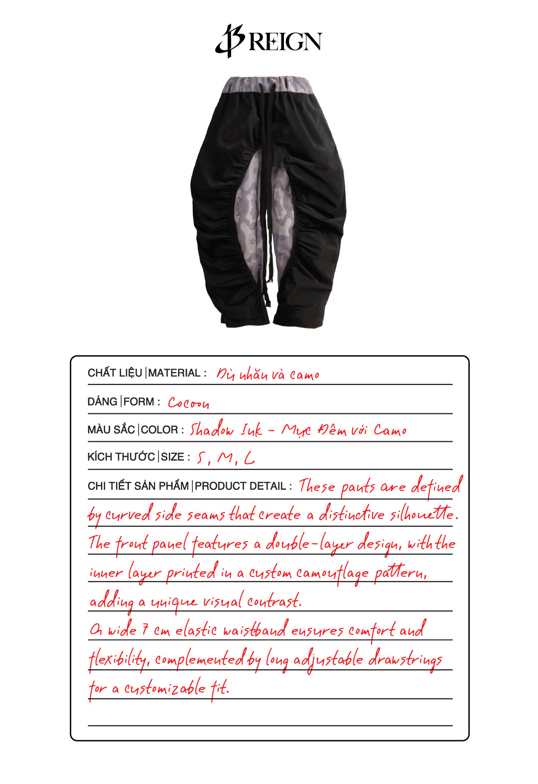 13Reign Hidden Camo Wrinkled Shell Cocoon Pants - Quần được tạo bởi đường công bên sườn, phân thân trước được may thêm 2 lớp, lớp trong trước được thiết kế riêng, tạo cảm giác thoải mái, thoáng mát. Bằng lưng thun lớn 7 cm, có dây đai điều chỉnh kích cỡ. Phù hợp cho nam và nữ, dễ mặc trong các dịp hằng ngày hoặc đi chơi. Thiết kế nổi bật với phong cách đồ họa và camo, sản phẩm được sản xuất tại Việt Nam, đảm bảo chất lượng và độ bền cao.