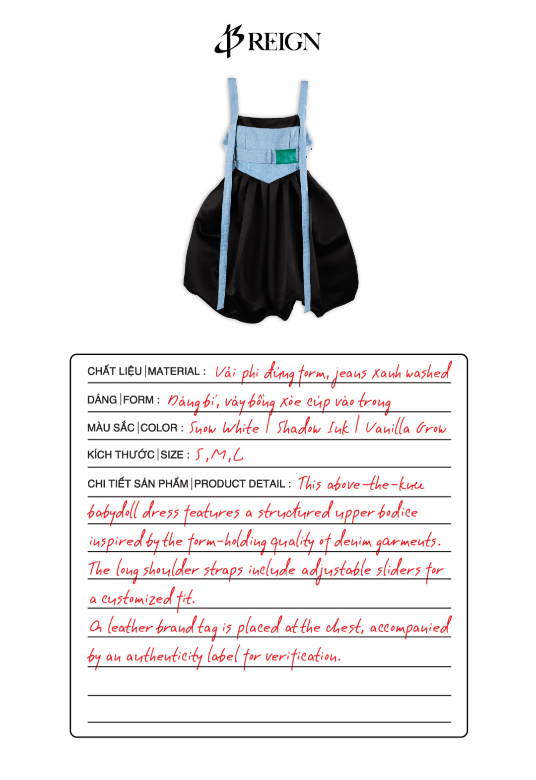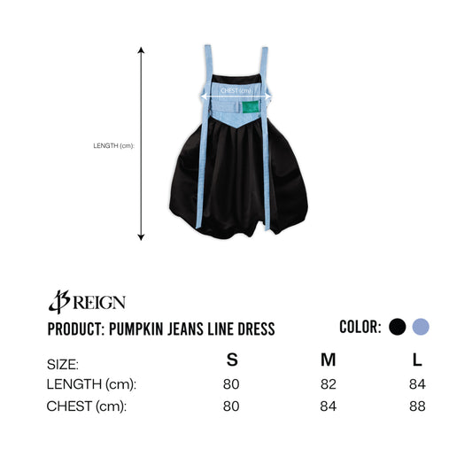 13Reign Pumpkin Jeans Line Dress - Đầm bí dài trên gối, phần thân trên được thiết kế lấy cảm hứng từ đô quần jeans cứng cáp giữ form, hai dây áo dài có tăng đơ điều chỉnh, tag da trước ngực và 1 tem chống giả ở phần.