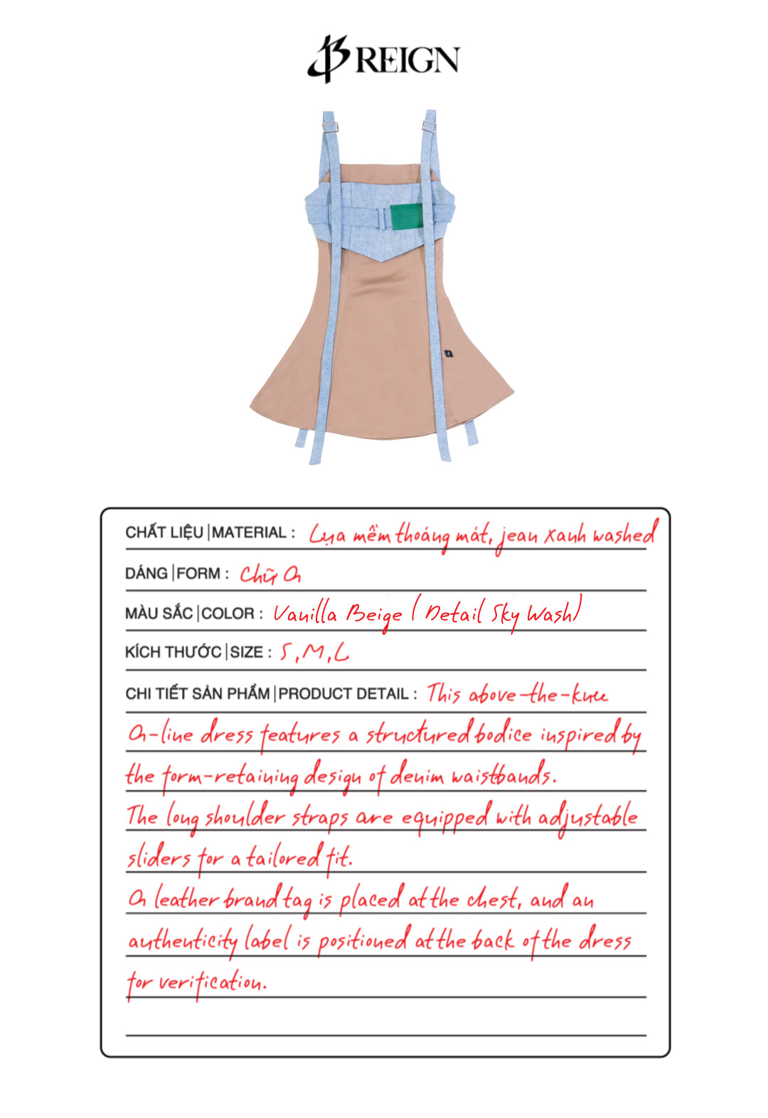 13Reign Jeans Line Dress - This A-line dress above the knee features a soft, breathable silk upper body and a denim hem design, perfect for women, ideal for everyday wear or casual outings. Its standout detail sky wash design offers a comfortable and modern feel. Made in Vietnam, ensuring high quality and durability. Adjustable straps suit various heights and back fits.