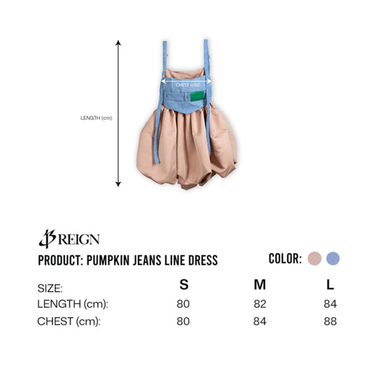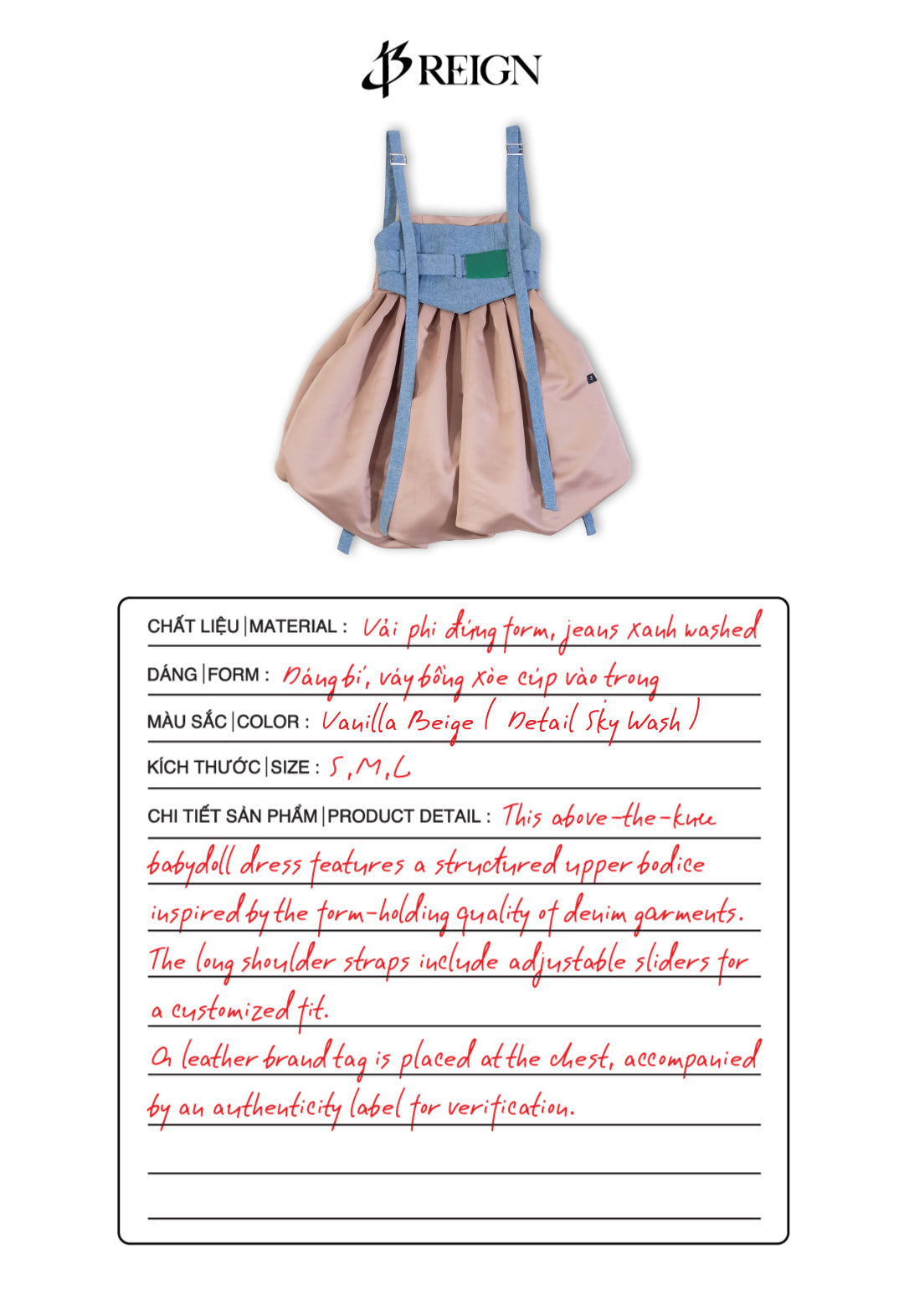 13Reign Pumpkin Jeans Line Dress - Đầm bí dài trên gối, phần thân trên được thiết kế lấy cảm hứng từ đô quần jeans cứng cáp giữ form, hai dây áo dài có tăng đơ điều chỉnh, tag da trước ngực và 1 tem chống giả ở phần.