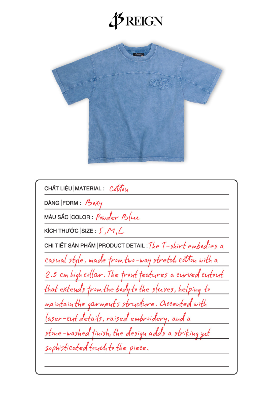 13Reign Boxy Tee – A modern casual boxy tee crafted from 2-way stretch cotton. The 2.5 cm high neckline adds structure, while the cutout seam flows from the torso to the sleeves, enhancing the silhouette. Finished with stone washing, laser-cut accents, and raised embroidery for refined detail.
