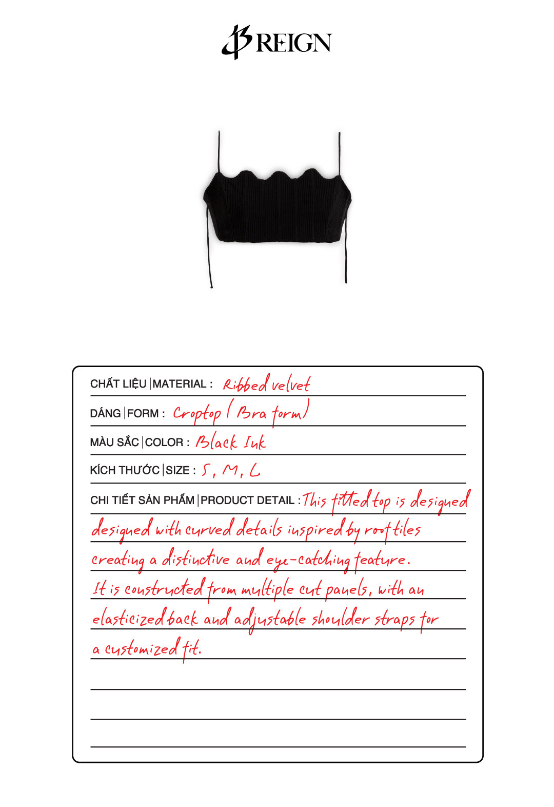 Thiết kế / Design: Áo croptop bra ôm ngực, đường cong cảm hứng từ mái ngói, thân sau dây co giãn, dây áo điều chỉnh